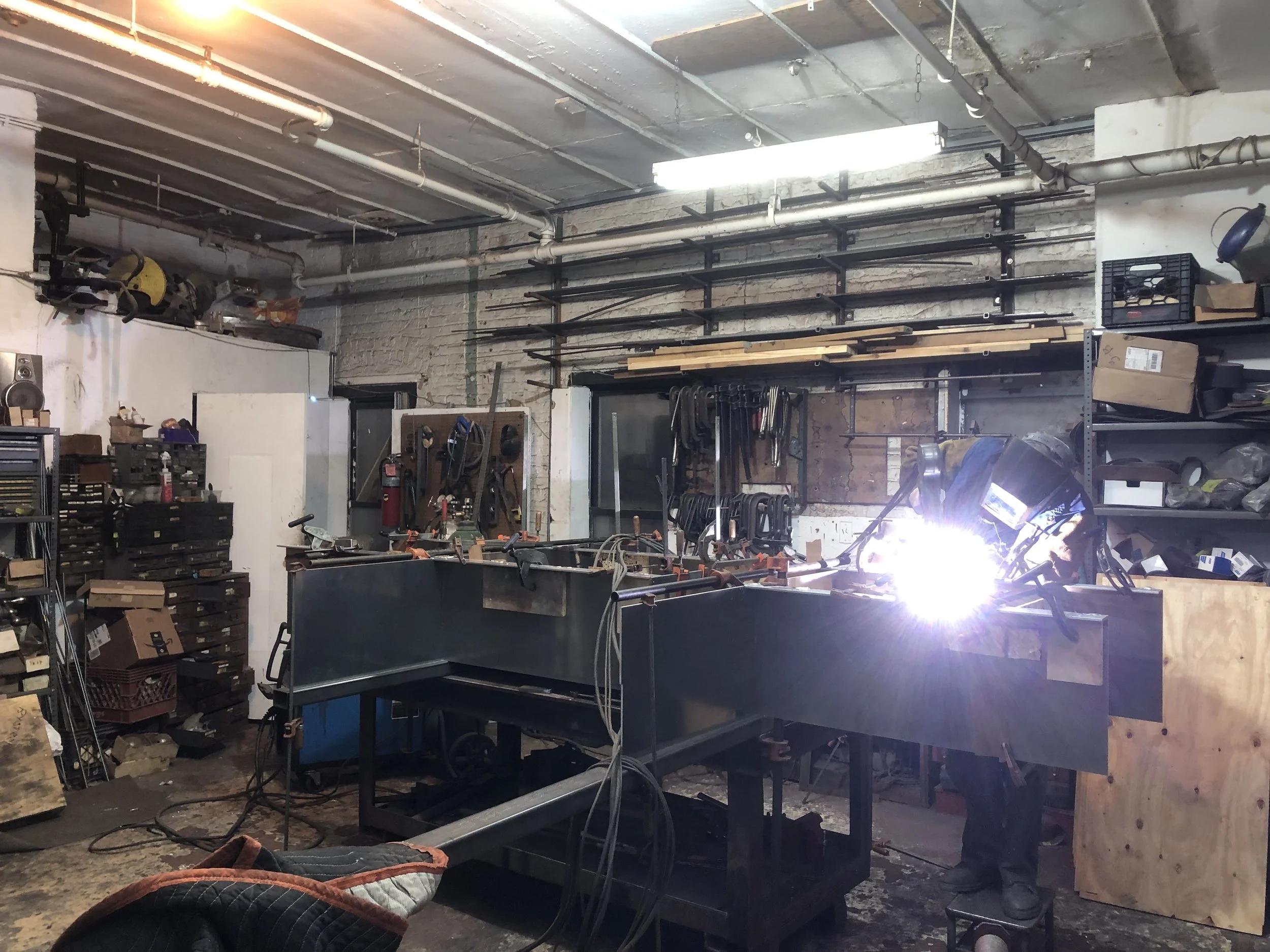 Featuring a large, minimalist visual merchandising display shelf clad in leather, made from slotted lasercut aluminum and powdercoated in red coral. Two countertops are mounted on either side of the shelves which have been hand patinated in a custom woody-brown finish and sealed with a marine grade clear coat.