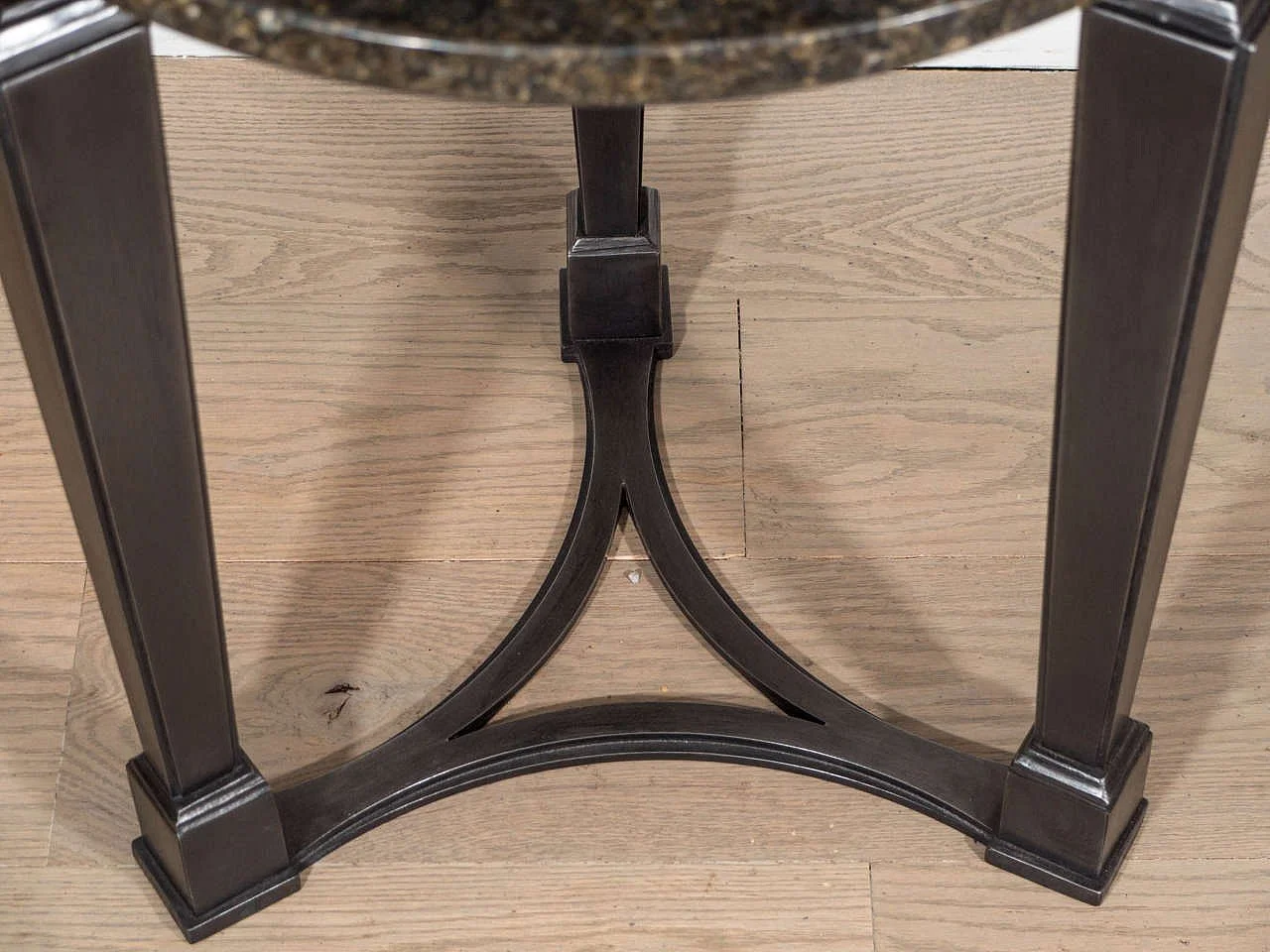 Made from steel with brass accents and a round stone top. Finished with an acid wash, gilder’s paste, and clear coat - shown here in Statuary Bronze and Gold.